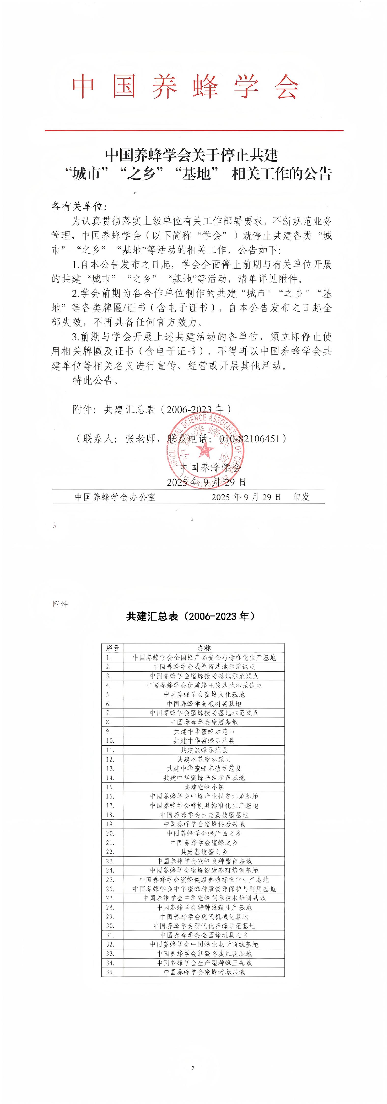 中国养蜂学会关于停止共建 “城市”“之乡”“基地” 相关工作的公告