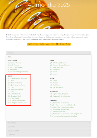 了解“全球蜂蜜吧”展示各国蜂蜜情况,可登录国际蜂联网站https:www.apimondia.org/honeybar.html。