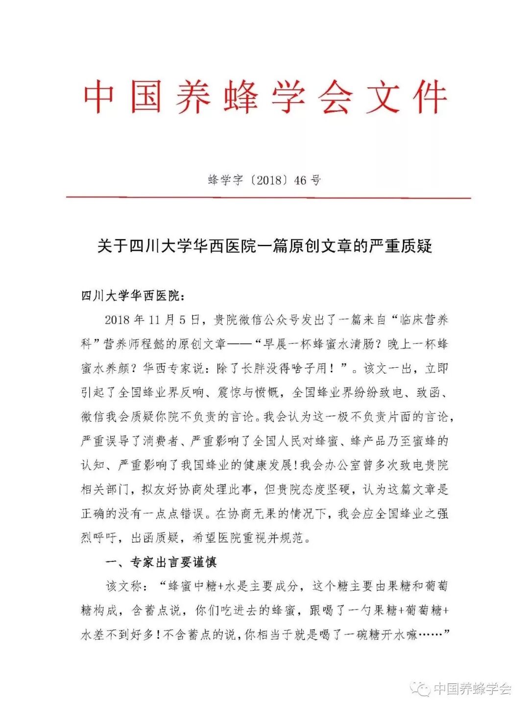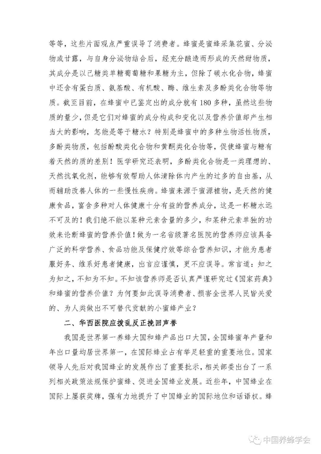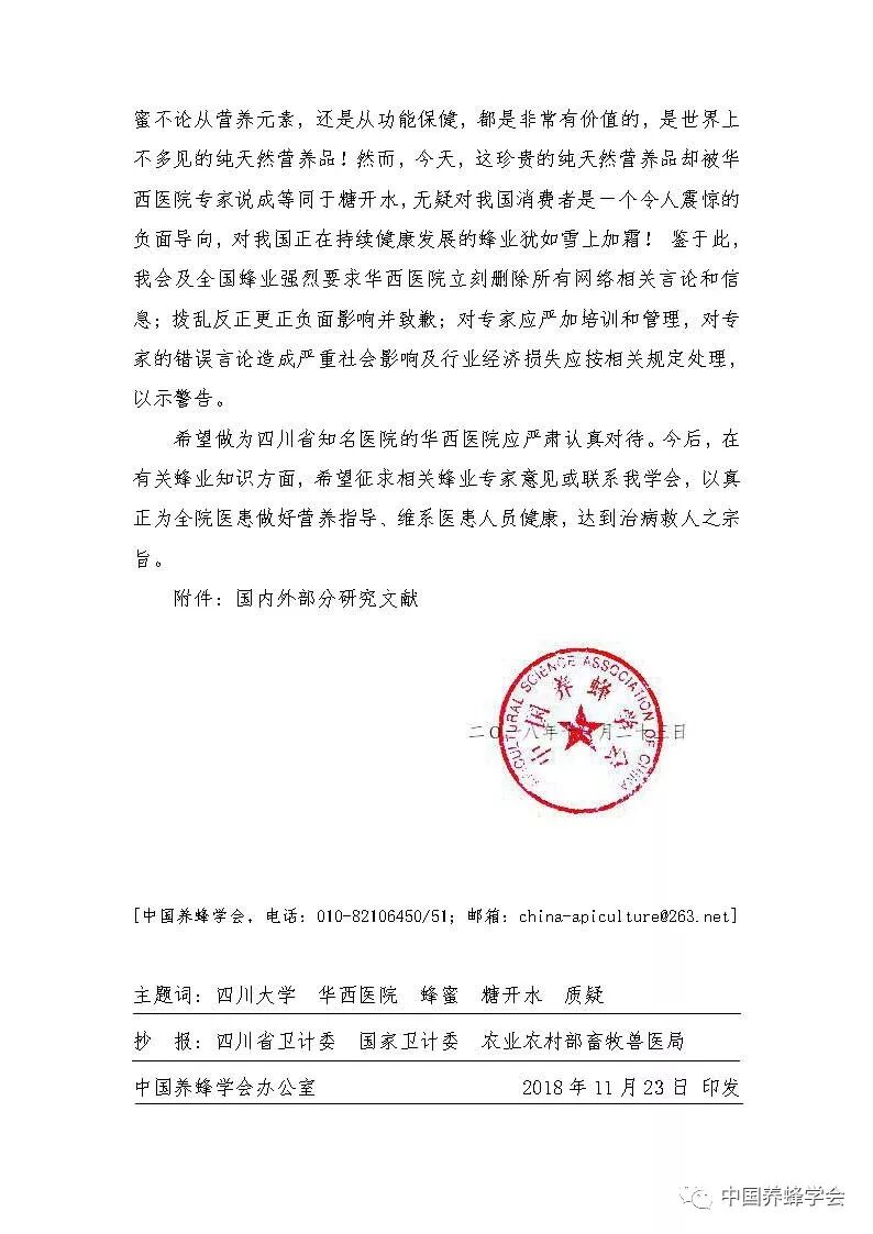 【编者按:11月23日,中国养蜂学会在与四川大学华西医院多次协商无果的情况下,出函严重质疑华西医院专家不负责任的言论。】