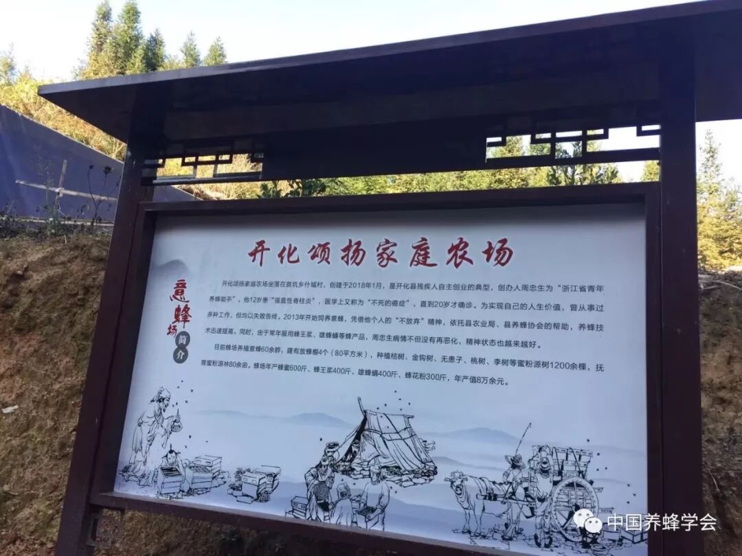 在颂扬家庭农场,主人周忠生养蜂脱贫增收的故事打动了在场所有的人。开化青年周忠生自幼患强直性脊柱炎造成残疾,行动不便家境十分困难,从事过多项工作但均以失败告终。2013年他从零开始摸索养蜂,在县畜牧局和养蜂协会帮助下,建了意蜂蜂场和中蜂蜂场,2018年全年养蜂收入达15万元,还带领周边农户一起养蜂,成为残疾人自主创业的典范。由于长年在蜂场劳作体能得到了锻炼,长期服用蜂产品病情有所好转,加之创业成功精神状态也越来越好,周忠生还被省蜂协授予 “浙江省十佳青年养蜂能手”称号。陈秘书长鼓励他以意蜂雄蜂蛹为新产品扩大生产并为他寻找到新的市场销路。