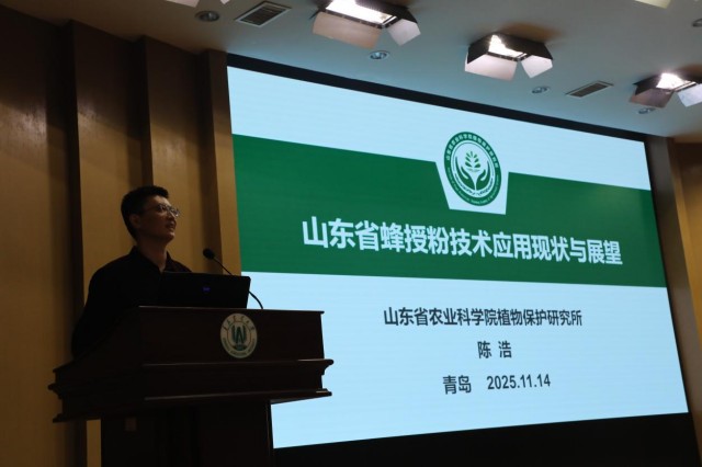 陈浩在“山东省蜂授粉技术应用现状与展望”报告中,系统分析了蜂授粉在现代农业中的生态与经济优势,并对比发达国家经验,详解山东省蜂授粉技术应用成效、挑战及对策。