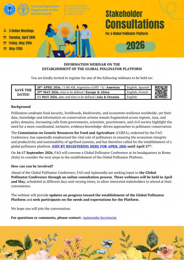联合国粮农组织(FAO)、国际蜂联(APIMONDIA)近期组织三场关于全球传粉媒介平台的研讨会,研讨会将通报全球传粉媒介平台筹建进展,并征集参会者对平台的需求与建议。